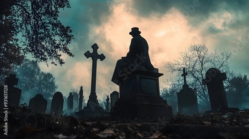 Silhouetted Figure in a Misty Graveyard with Gravestones and a Cross Casting an Ominous Atmosphere