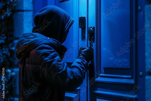 burglary, thief, crime, security, night, intruder, trespassing, silhouette, hoodie, door lock, blue light, shadow, eerie, ominous, front door, risk, danger, law, illegal, stealth, covert, mystery, fear, protection, alarm, lock, residential, property, violation, prevention, detection, surveillance, enforcement, patrol, police, investigation, nailing, prosecution