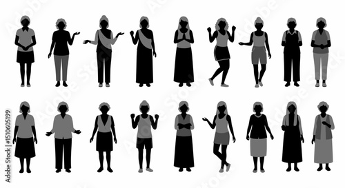 silhouette, figure, woman, female, people, diversity, age, size, shape, form, outline, illustration, vector, icon, symbol, group, standing, posture, gesture, fashion, style, clothing, dress, skirt, pant, short, caucasian, african, indian, asian, middle eastern, senior, adult, young, girl, lady, person, population, community, collection, set