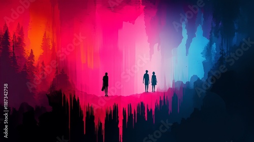 Silhouetted figures stand at the edge of a vibrant, surreal landscape. Pink and blue hues dominate the scene, creating a dreamy, otherworldly atmosphere.