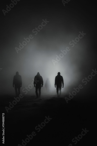 fog, silhouette, figure, walking, darkness, night, mysterious, journey, path, light, distant, tunnel, hazy, obscure, shadow, indistinct, group, three, man, movement, adventure, suspense, unknown, eerie, gloomy, atmosphere, landscape, greyscale, monochrome, dramatic