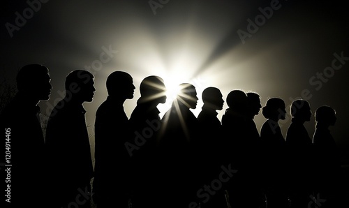 Silhouetted group facing bright light, hope, future, community