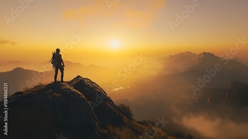 Silhouetted Hiker Stands Triumphantly at Mountain Peak Amid Glowing Sunrise Landscape