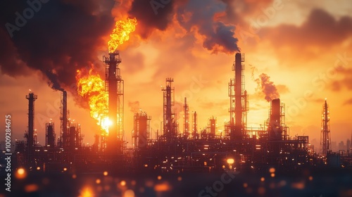 plant, sunset, flames, smoke, industrial, power, factory, sky, silhouette, orange, red, cloud, tower, refinery, pollution, environment, energy, steel, industry, production, chemical, manufacturing, technology, urban, city landscape, horizon, landscape, construction, machinery, background, abstract, modern, dark, light, contrast, texture, pattern, detail, design, gloomy, dramatic, fiery, metallurgical, emission, heat, glow, atmospheric, industrialized, night