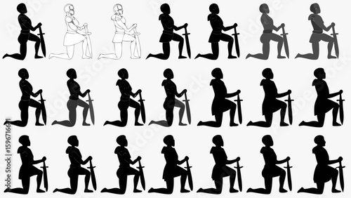 knight, sword, silhouette, kneeling, armoring, greyscale, pattern, mediaeval, warrior, presentation, row, figure, outline, pose, weapon, symbol, historical, uniform, soldier, combat