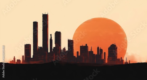 Silhouetted modern city skyline with tall skyscrapers against a large red-orange setting sun and pale sky background