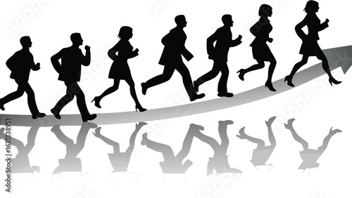 Silhouetted people running upwards on an arrow with reflections indicating growth and forward movement