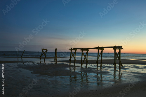 Silhouetted Pilings at Blue Hour Over Calm Coastal Water