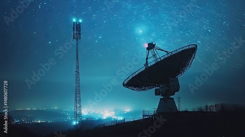 night, sky, star, telescope, radio, communication, tower, city, light, landscape, silhouette, dark, blue, misty, atmosphere, huge, horizon, distant, illumination, technology, modern, antennae, futuristic, equipment, observatory, astronomic, space, urban, illuminated, structure, metal, steel, wireless, signal, light, glow, background, outdoors