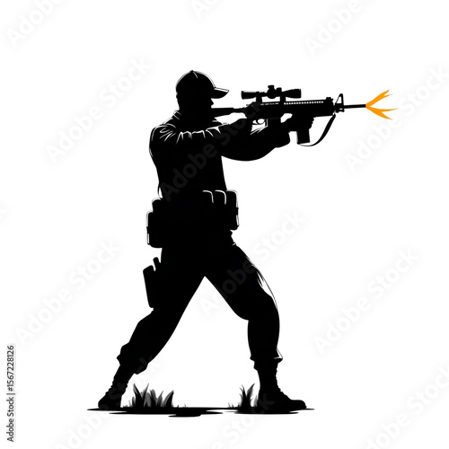 soldier, silhouette, firing, weapon, gun, rifle, army, military, combat, action, shooting, black, white, background, graphic, design, illustration, artwork, vector, dark, shadow, power, force, intensity, danger, threat, security, protection, stealth, sharpshooter, aiming, target, precision, war, battle, conflict, video game, game