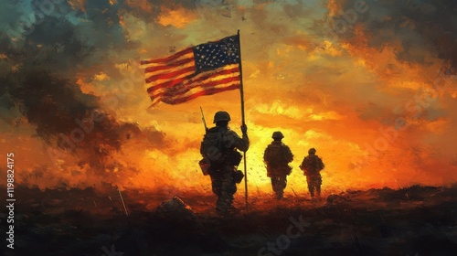 Silhouetted Soldiers Carrying American Flag at Sunset