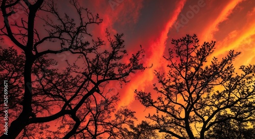 Silhouetted tree branches against a vibrant red-orange-yellow sunset sky creating a dramatic and enchanting natural landscape scene.