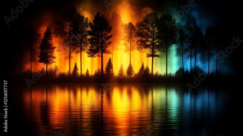 tree, forest, fire, water, night, dark, silhouette, flames, orange, yellow, blue, green, mystical, magical, surreal, colourful, vibrant, calm, still, lake, duck pond, river, nature, landscape, artwork, digital, art, image, picture, photograph, scenery, environment, wood, light, shadow, enchanting, serene, peaceful, calmness, beauty