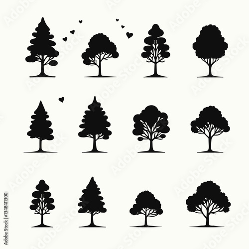 tree, silhouette, forest, nature, shape, design, element, icon, symbol, collection, pattern, grid, arrangement, art, illustration, graphic, decorative, variety, assortment, botanical, flora, foliage, growth, plant, environment, nubes, love, romantic, valentine, minimalist, simple, clean, style, artistic, drawing, vignetting, outline, structure, branch, trunk, leaf, timberland, park, garden, tree branch