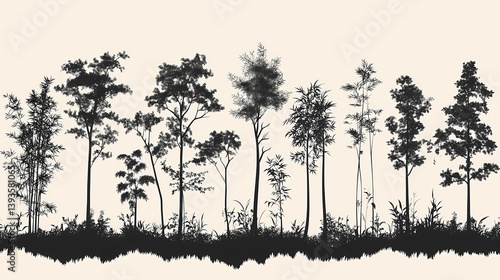Silhouetted Trees in Forest: Black and White Nature Artwork for Tranquil Woodland Landscapes and Nature Design