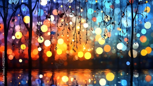 Silhouetted trees reflected in a vibrant, bokeh-filled water, sunset hues