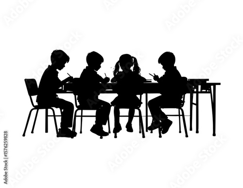 Silhouettes childrens at a table reading; educational, learning, literacy, back to school, diversity, teamwork, childrens activities.