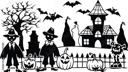 Silhouettes for the Halloween Vector illustration. Ghost, Pumpkin head with baseball bat, Cat with knife. Halloween concept. white background