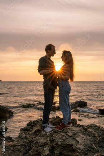 silhouettes in love romantic couple lovers hugging, kissing, touching, eye contact at sunset, sunrise on the background of the sea, the sun, the clouds in fiery red, orange colors