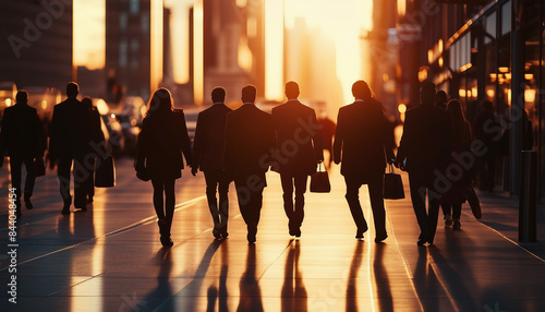 silhouettes of business people crossing the pedestrian walkway in new york, sunset cityscape