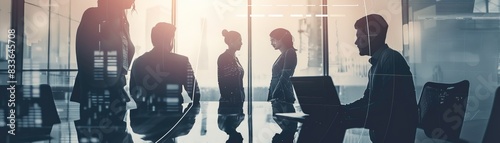 Silhouettes of business people in a modern office setting, engaging in discussion and collaboration during a meeting, with sunlight in the background.