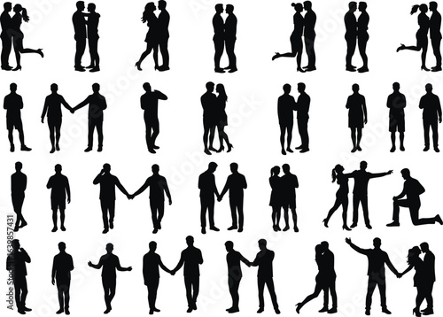 Silhouettes of couples in various poses, romantic and casual interactions, vector illustration of man and woman together, black silhouette set