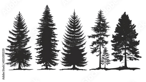 Silhouettes of five different conifer trees on a white background, showcasing various shapes and sizes, ideal for nature or design concepts.
