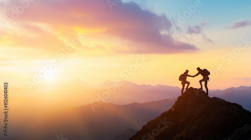 Silhouettes of Hikers Helping Each Other Reach Mountain Peak at Sunset. Teamwork and Adventure Concept.