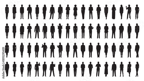 Silhouettes of men in various poses in dark uniform on white background for business illustration