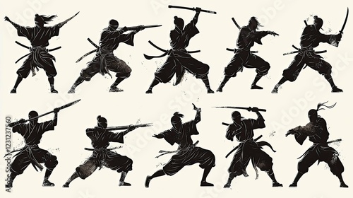 Silhouettes of Ninjas in Action: Japanese Martial Arts, Sword Fighting, and Warrior Poses