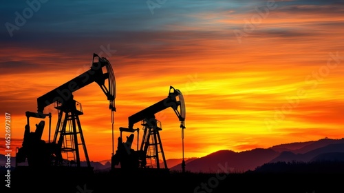 Silhouettes of oil pumpjacks operate against a vibrant sunset sky with colorful clouds and distant hills
