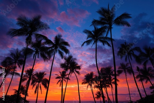 sunset, palm, tree, silhouette, sky, colours, cloud, orange, pink, purple, blue, tropical, beach, ocean, horizon, vibrant, dramatic, warm, colours, nature, landscape, photo, image, beautiful, peaceful, evening, dusk, tranquil, scenic, paradise, exotic, hawaii, coastline, silhouette, dark, light, warmth, cloudscape, summer, gold, golden hour, vacation, travel, relaxation, romance
