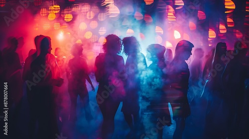 club, people, dancing, nightlife, silhouette, hazy, light, music, party, entertainment, dark, energy, fun, movement, smoke, atmosphere, blurry, colourful, glow, vibe, disco, night, crowd, joyful, social, celebration, event, clubbing, bright, abstract, shadow, motion, festive, mood, dynamic