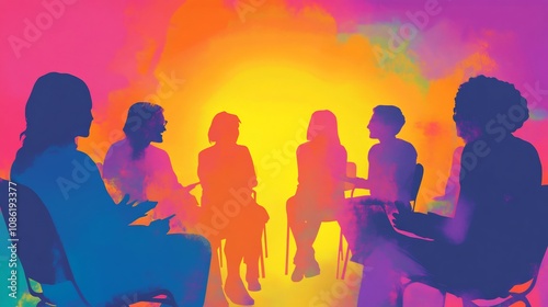 support, group, meeting, people, silhouette, circle, gathering, colourful, background, bright, vibrant, orange, yellow, pink, purple, abstract, art, illustration, digital, painting, design, community, togetherness, connection, oneness, sharing, listening, empathy, understanding, healing, growth, hope, strength, inspiration, positive, optimistic, human, interaction, relationship