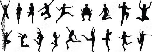 silhouette, people, dynamic, pose, dance, movement, jumping, bending, stretching, arms raised, white background, action, energy, motion, variety, diverse, expressive, artistic, abstract, activity, celebration, joy, freedom, creativity, performance, lively, fun, playful, athletic, graceful, fluid, modern, contemporary