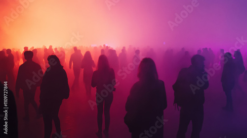 people, silhouette, crowd, orange, purple, haze, surreal, energy, mystery, atmosphere, dynamic, motion, soft light, vibrant, colourful, gradient, dreamlike, abstract, urban, movement, artistic, fog, mist, contrast, warmth, cinematic, modern, depth, aethereal, collective, abstraction, futuristic, dreamscape, introspective, moody, urban setting, mysterious, transition, creative