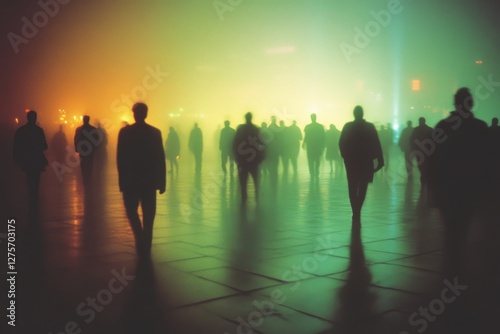 Silhouettes of people walk through a foggy, illuminated square, creating a mysterious, ethereal scene blending into vibrant hues of orange and green.