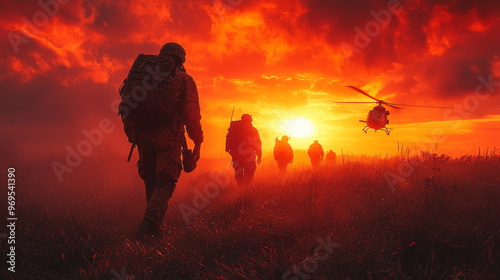 soldier, military, sunset, helicopter, silhouette, camouflage, grass, field, orange, red, sky, shadow, dramatic, powerful, war, conflict, combat, army, military service, man