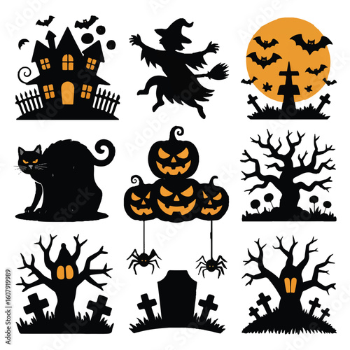 Silhouettes of spooky halloween elements, including a haunted house, witch, moon with bats, cat, pumpkins, trees, spiders, and tombstones
