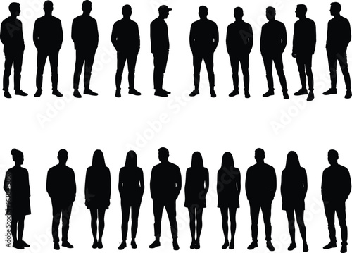 Silhouettes of standing men and women, casual poses, front and side views, diverse people illustration, group formation and social arrangement