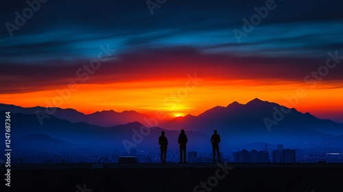 Silhouettes of three individuals against a vibrant sunset over mountain peaks.