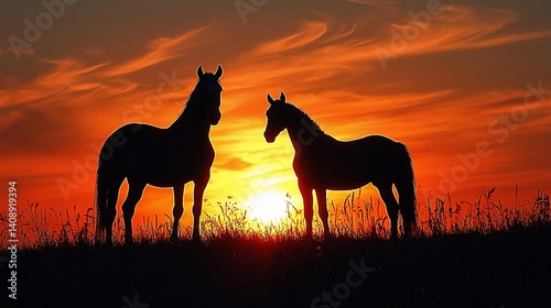 Silhouettes of two horses at sunset