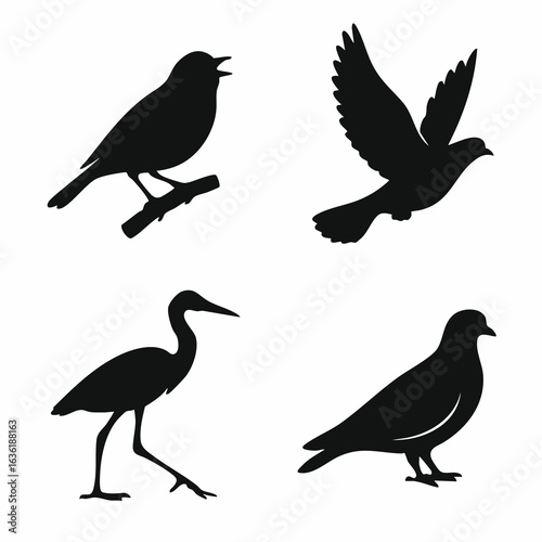 bird, bird, silhouette, silhouette, black, white, flying, flight, tree branch, singing, heron, pigeon, dove, wing, beak, feather, nature, wildlife, animal, animal, vector, illustration, design, graphic, art, isolated, shape, set, collection, icon, symbol, outline, simple, minimalist, style, drawing, fauna, avian, creature, perched, standing, walking, profile, side, view, element, concept, template, logotype