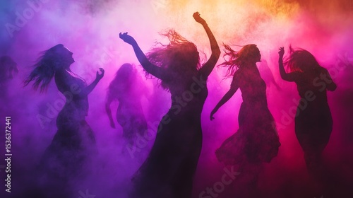 Silhouettes of women dancing in vibrant colored powder.