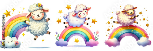 silly, sheep, jumping, rainbow, star, sparkle, watercolor, clip art, illustration, fantasy, fun, playful, whimsical, cute, gold, cloud, colourful, vibrant, nature, dream, isolated, background, magical, joyful, light, animal, flower, design, art, spring, colours, decoration, floral, cartoon, happy, holiday, element, leaf, love