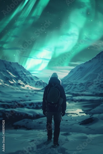 woman, man, snow, mountain, aurora, green, turquoise, blue, silhouette, body, spectacular, minimalist, unbelievable, epic, christmas, backpack, trek, travel, nature
