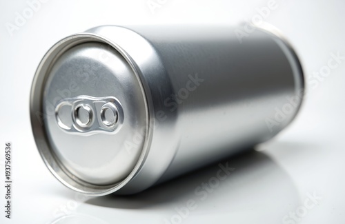 Silver aluminum beverage can lies on side close up. Smooth metal surface reflects light. Unopened container, ready for drink or soda. Product packaging for refreshment.