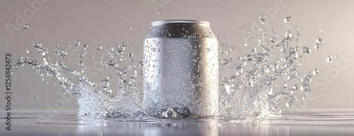 can, water, splash, drink, beverage, soda, aluminium, refreshment, cold, liquid, fresh, clean, pure, fizz, bubbly, cool, icy, summer, thirst, quench, texture, background, design, template, product, cardboard box, advertising, marketing, commercial, image, photo, studio, isolated, white, grey, metal, shiny, dripped, wave, ripple