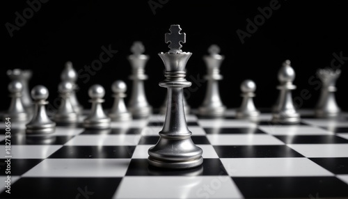 Silver Chess Pieces on a Black and White Checkerboard Background with Focus on King Piece in the Foreground