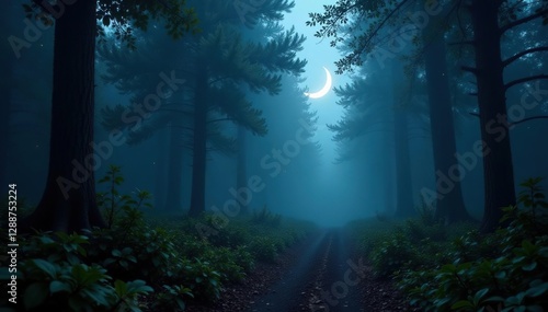 Silver crescent illuminates misty forest trail, path, mystical